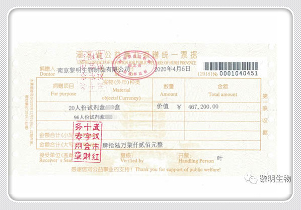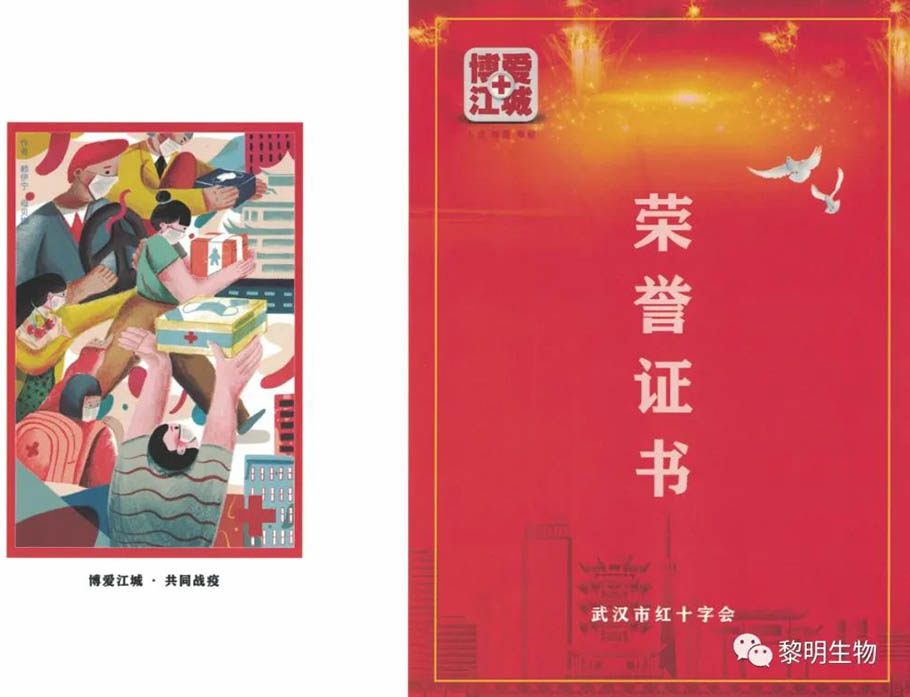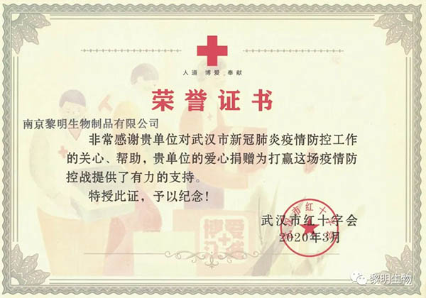 2020年2月初,在正值全国上下群防疫情的关键时期,南京黎明生物公司积极响应国家号召,凭借着对产品质量一贯的追求和高度的社会责任感,及医院之所急,向武汉红十字会捐赠了疫情防控的急需医疗物资(新型冠状病毒IgM及IgG抗体二联检测试剂盒、新型冠状病毒(SARS-COV-2)多重RT-PCR试剂盒 )助力疫情防控,承担起了企业应有的责任和社会担当,体现了对奋战在防治疫情第一线的广大医务工作者的关爱。